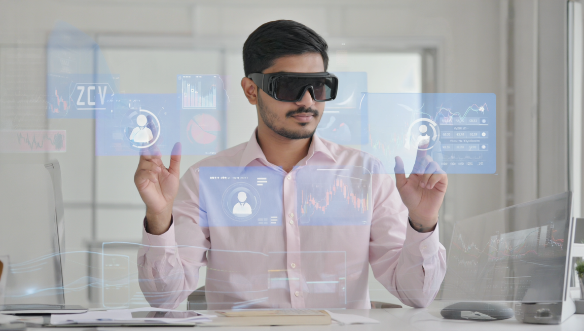 The AI assistant lets you query market trends and adjust strategies using gestures, voice, or eye movement in the 3D sandbox.