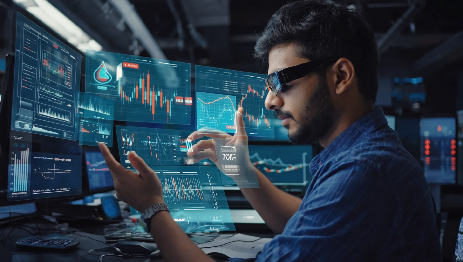 AR augmented reality access and holographic display: AI provides real-time data analysis, emotional stress management, and intelligent decision support, visualizing the crypto world